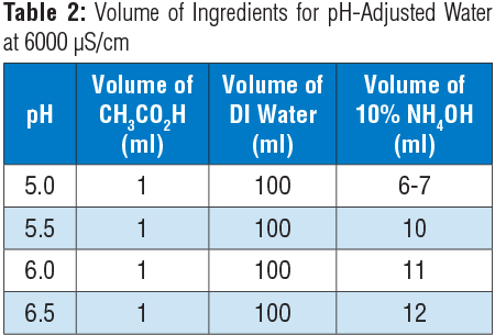 Tables 1 and 2 show the ingredients for pH-adjusted waters at 1000µS/cm and 6000µS/cm, respectively. If solutions in these tables will be prepared, follow the indicated volumes of acetic acid, DI water, and ammonium hydroxide for steps 1 and 2.