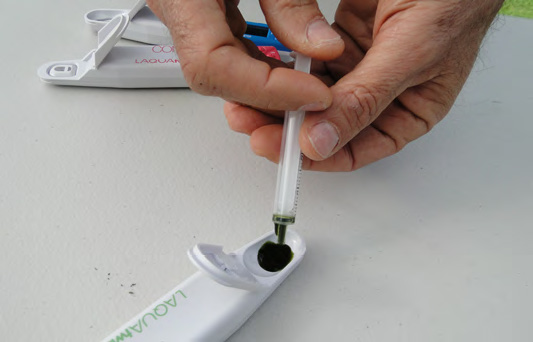 Pocket-sized LAQUA twin Nitrate Ion meter was used to measure nitrate-N concentrations in verdure sap. It eliminates the need to transport samples to a laboratory for expensive analysis performed using either colorimetry or chromatography by trained analyst.