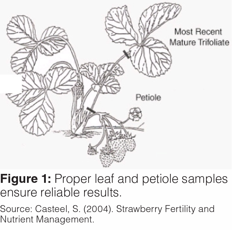 For sampling, it is critical to always follow the same protocol and collect the correct tissue in order to get consistent and reliable results. The most recent mature trifoliate leaf is the best indicator of the most essential nutrients for plant growth (e.g., P, K, Ca, etc.) and the petiole from this leaf is the best indicator of NO3-N. Plant temperature should be within 20 to 25°C.